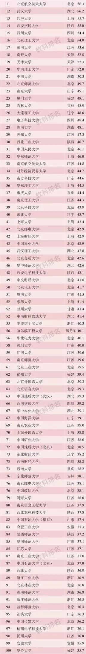 在清华大学、北京大学、浙江大学之后,上海交通大学、复旦大学、中国科学技术大学、华中科技大学、南京大学、中山大学、哈尔滨工业大学依次排在4到10名。其中,华中科技大学比去年同期上升1名,与南京大学并列第七。