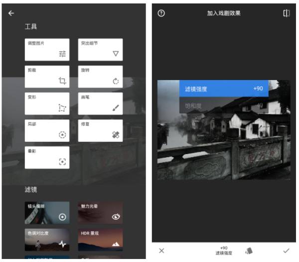 在功能上,虽说相比 Enlight 逊色一些,但也算是非常丰富,足够应付日常了。而 2.0 版的全手势操作,使 Snapseed 一跃成为 iOS 最易用的摄影后期应用之一,竖滑更改调节项,横滑调节效果强度,大部分操作都能通过一根手指完成,使移动端修片变得更为高效便捷。此外,2.0 全新的 UI 设计也为 Snapseed 平添一份时尚杂志的美感。功能齐全,界面精致,操作便捷,重点是完全免费,如果你不想在应用上花费太多的钱,Snapseed 会是你的首选。
