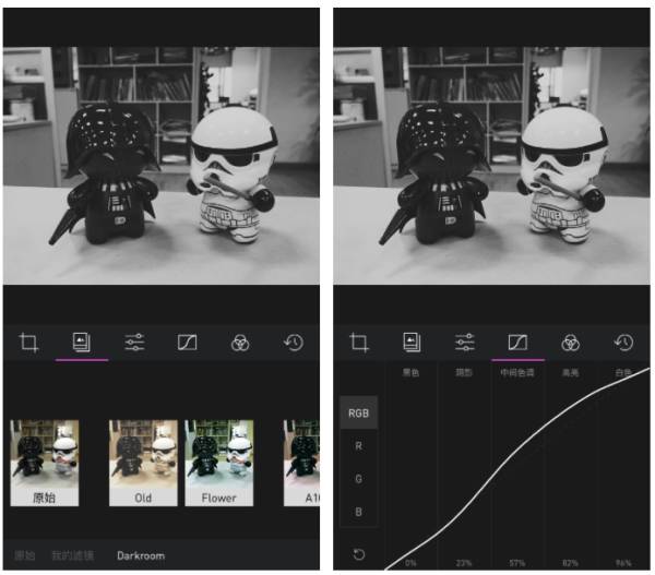 Darkroom 将曲线分为「黑色」「阴影」「中间色」「高亮」「白色」五个部分,将复杂的曲线「简单化」。即便从未接触过曲线调色,也能从字面意义上了解变动这一区间对画面有何影响。它或许不够其他曲线应用精细,但对于手机修图来说,真的足够了。如果 VSCO 的滤镜不如你意,基础的调色工具也无法满足你的个性化需求,那兼具个性化与易用性的 Darkroom 便是你今年最不能错过的应用。