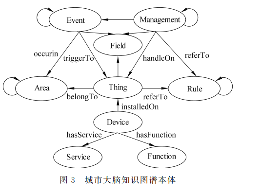 物联网协议设计存在多个标准,如 oneM2M、 LWM2M、FIWARE 等,不同的标准之间存在兼容 性问题[13],无法借助某一标准纳入所有的设备。以 知识图谱作为物联网本体的上层概念可以解决不同 标准的设备信息互通问题。城市大脑知识图谱除了 关于物联网设备的类型描述,还有运行状态、地理信 息、维护人信息、厂商信息等。在物联网知识图谱概 念上接入城市要素[14],可以使其满足城市复杂场景 下的知识图谱本体。城市作为复杂系统,无法设计出满足所有事物 的本体系统,但基本上属于“人”“物”“事”范畴。这 里的“人”包括自然人、组织和部门等各类主体,“物” 包括地址、楼宇、物联网设备等客观存在,“事”包括 城市事件、规章制度、新闻等。将“人”“物”“事”为核 心的城市要素融入物联网本体系统可以得到覆盖城 市基本概念的知识本体,在此基础上延伸出9类城 市本体,包括: 设备(Device)、服务(Service)、功能 (Function)、部件(Thing)、管理(Management)、事 件 (Event)、区 域 (Area)、领 域 (Field)和 规 则 (Rule),具体如图3所示。