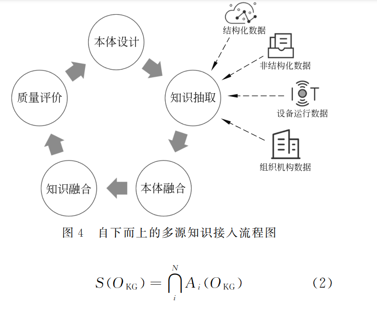 采用自顶向下的知识工程设计方法可快速形成 城市知识图谱本体 (图 3)。依据本体接入多源知 识,包括知识抽取、本体学习融合、数据融合、质量评 价、更新本体。接入的数据一般来源于多部门、多渠 道,数 据 形 式 包 括 物 联 网 数 据、文 本 数 据、视 频 音 频等。多源知识图谱融合方法分为基于多领域知识图 谱的融合方法和基于多源异构数据的融合方法[15], 将不同领域的知识图谱融合是快速构建知识图谱的 重要方法,不同领域知识图谱的融合方法包括概念 融合、实体对齐、属性对齐和属性值融合等步骤;基 于多源异构数据的融合方法包括基于非结构化抽 取、结构化映射的知识抽取和基于已有图谱的知识 推理以及知识准确率评估等步骤。通过对接入的子本体、领域本体进行学习、消 歧,实现知识概念的融合,通过质量评价对融合结果 纠正,最终形成知识图谱并更新本体,自下而上的消 息知识接入流程如图 4 所示。在自下而上的过程 中,可以实现本体动态完善流程,最终形成城市场景 下的知识本体。知识学习采用自下而上子本体互相叠加形成完 整本体,更加符合城市大脑知识图谱建设流程。因 此,若将i个类型本体定义为Ai 则包含所有本体 S(OKG)的定义如式(2)所示。