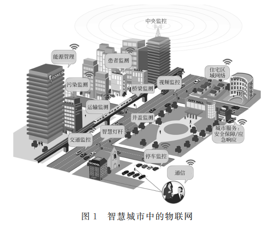城市大脑是诞生在中国的原创科技成果,也是 城市建设和前沿科技领域的热点,迄今为止,全国已 经有数百个城市宣布建设城市大脑。相较于智慧城 市侧重城市垂直领域产业升级,城市大脑着眼于全 面的城市智能化建设,即从感知智能到认知智能的 升级。研究指出[1],城市神经元网络和城市云反射 弧将是城市大脑建设的重点。在5G、大数据、人工智能、工业互联网等新一轮 科技浪潮的推动下,大规模物联网传感器部署到城 市中,涵盖智能生活、智能制造、智能交通、智能治理 等领域(图1),领域内设备网络组成了城市当中的 感知物联网系统,服务城市设施智能化升级和领域 智慧化建设。城市物联网设备运行按照领域进行划分、部署、 联网和管理,建设往往有较为完整的接入平台和应用系统[2],提供数据采集、上传和分析等功能,如利 用物联网建立医疗监控系统对病人的健康状况进行 监测[3]。在物联网设备运行过程中,会产生大量数 字、文本、图片、音视频等多种形式数据, 然而设备与 周边环境之间、不同领域设备之间存在信息无法打 通、跨领域缺乏统一规范等问题,导致数据资源无法 有效利用。