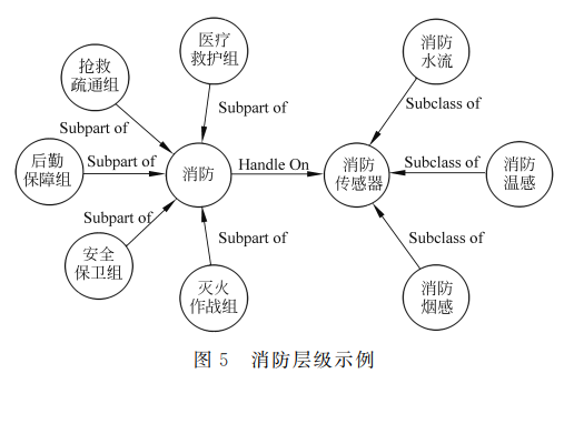 以北京市海淀区城市智能物联网设备和属地信 息要素作为数据来源,构建服务城市管理和治理的 知识图谱。海淀区作为信息化和智能化较高的区 域,在电子政务、社会管理等方面具有较规范化的数 据,以物联网数据为例,目前具有20多类物联网设 备,涉及环保、市政、消防、安全等领域,相关数据信 息主要为结构化数据,如设备、功能、区域等;部分为 半结构化、非结构化数据,如城市事件、政策法规等。在数据特点上,城市中的概念存在较多层级,即相同 类型节点具有子类或父类,利用概念层级(level)对 每类进行划分,以消防为例,消防传感器概念具有子 类(Subclassof)关系,其管理者消防队具有子部门 关系(Subpartof),示 意 如 图 5 所 示,实 体 形 式 如 表1所示。