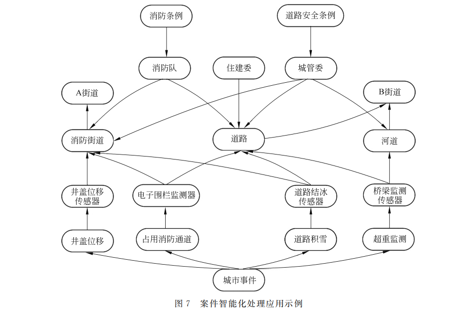 城市大脑知识图谱在案件智能处理中将发挥重 要作用,示例如图7所示。当占用消防车道事件发 生,消防通道传感器(Device)的功能(Function)记 录相关信息,服务(Service)将记录占用者信息并报 警,将 占 用 车 车 牌 等 详 细 信 息 反 馈 给 案 件 管 理 (Management),管理者再根据地址区域(Area)、规 章(Rule)等信息对违章停车事件快速干预处理,做 到未诉先 办。与 此 同 时,市 民 热 线 投 诉 消 防 通 道 占用,通过事 件 抽 取 模 型 将 非 结 构 化 文 本 抽 取 出 事件的 地 址(Area)、事 件 类 型(Field)和 主 体 等 信 息,综合二 者 确 立 案 件 派 发 处 理 人。管 理 方 面 将 会参考(referTo)相关规章制度(Rule)执行相应的 操作。