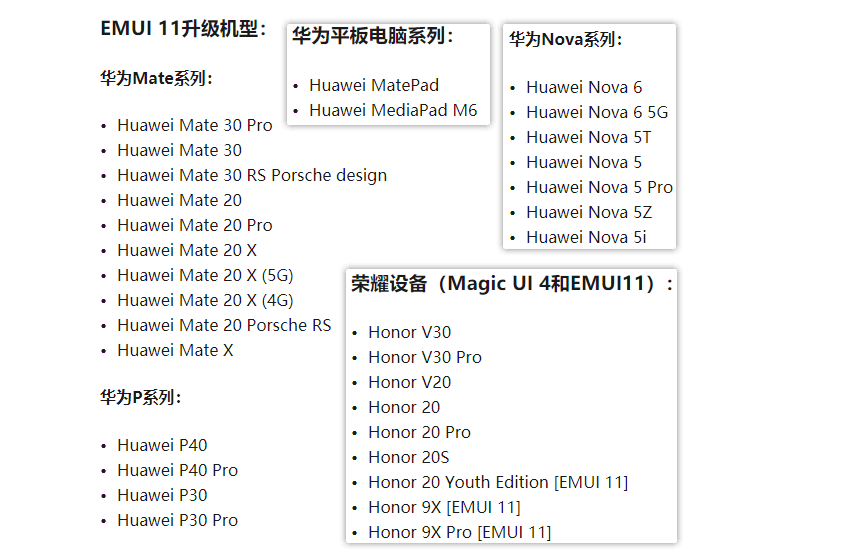 根据华为高管透露的信息,EMUI 11 会对分布式唤醒技术进行升级,着重改进智慧分屏、畅连通话等功能。按照以往的产品生命周期,预计以下产品会升级到 EMUI 11 操作系统。