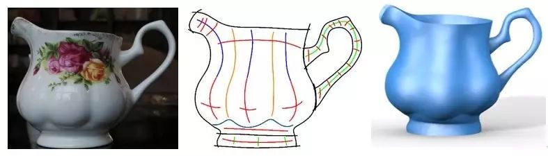 图4 茶杯:参考图片、平面草图、和对应的三维物体(平面草图定义了正面的形状,背面通过对称获得)