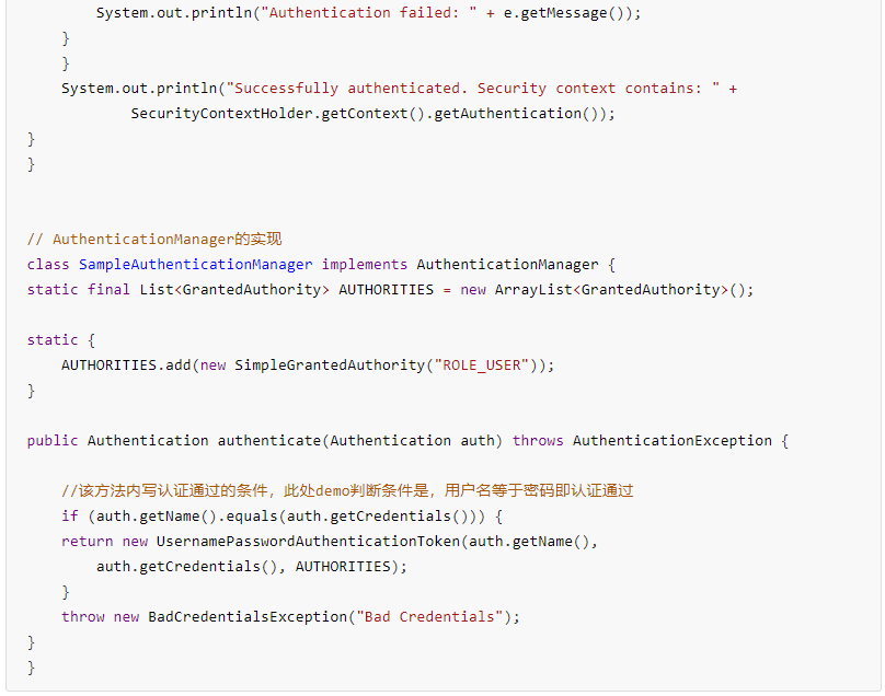 完成以上过程后,当前用户认证完成。以下代码示范了一个认证环节最基本的流程(并非SpringSecurity框架源码)