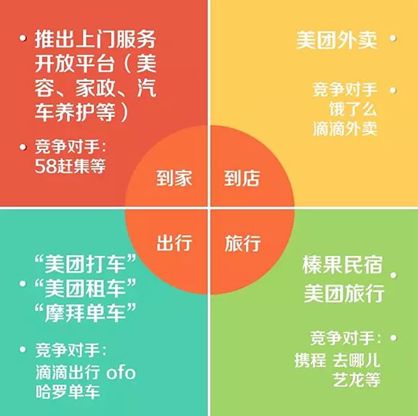 2017年12月,美团点评组织架构调整为四大事业群,即以外卖为核心的大零售事业群,酒店旅行事业群,出行事业群,以及包括传统的团购业务在内的到店事业群。美团的投资方向也开始逐步从外卖、餐饮扩展至酒店旅行、出行和文娱等领域。