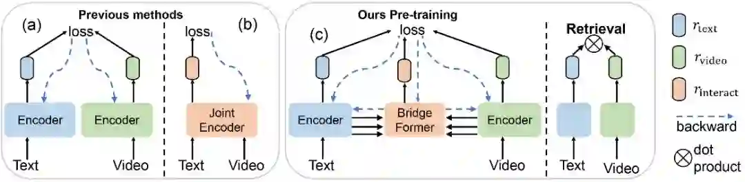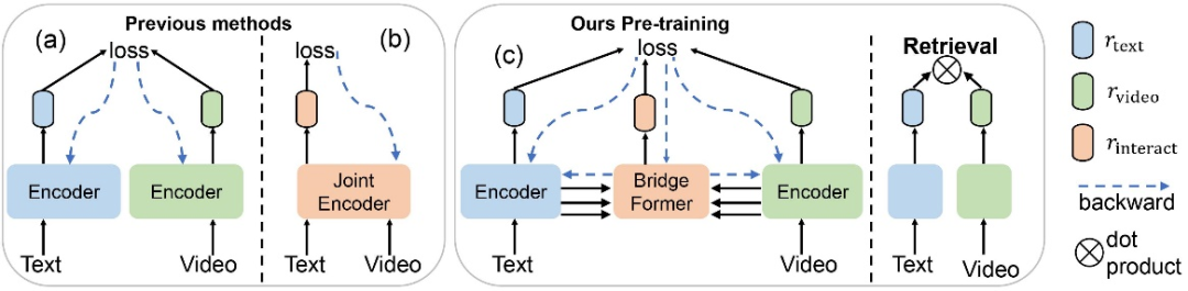 具体来说,如上图(c)所示,基于双编码器的结构,该研究进一步设计一个参数化模块 BridgeFormer 作为视频和文本局部特征的纽带。该研究提出一个新的借口任务来约束 BridgeFormer,由于 BridgeFormer 联结了视频和文本的每一层特征,对 BridgeFormer 的约束进而会优化视频和文本的特征。辅助的 BridgeFormer 只用于预训练,在下游检索时被移除,从而保证了高效的双编码器结构可用于检索。