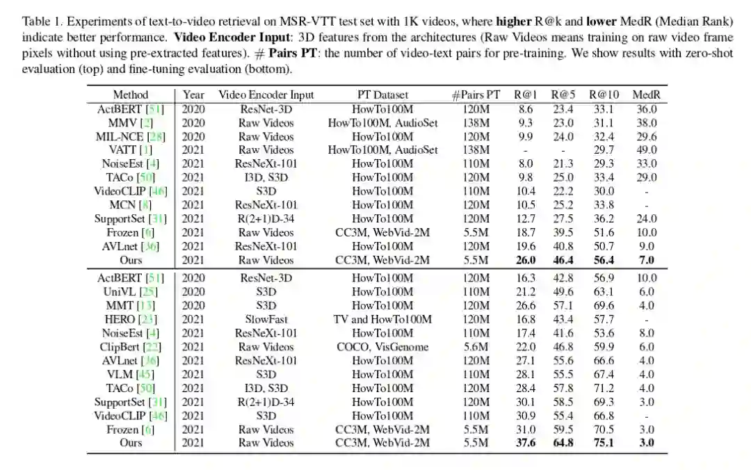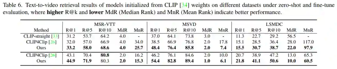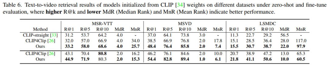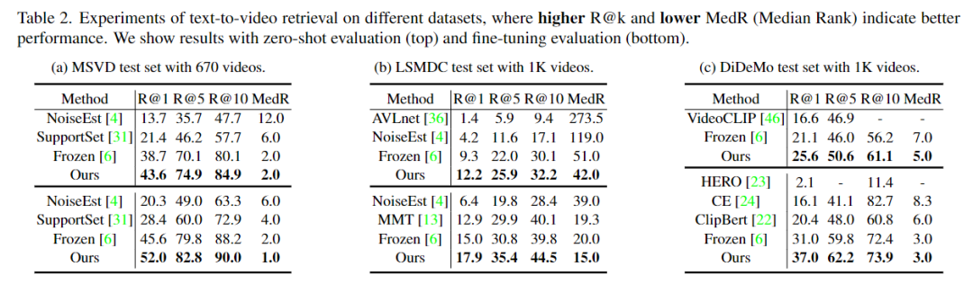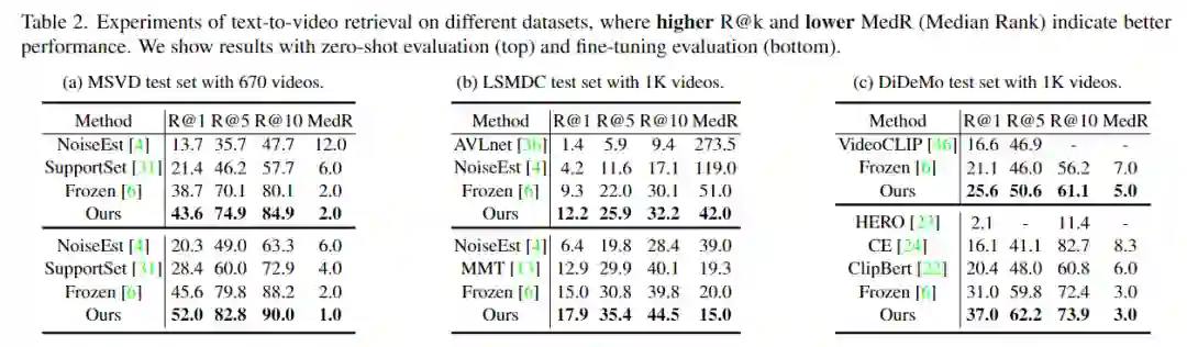 该研究在 MSR-VTT、MSVD、LSMDC、DiDeMo 和 HowTo100M 上进行测评。采用两种测评准则,包括 zero-shot 和 fine-tune。