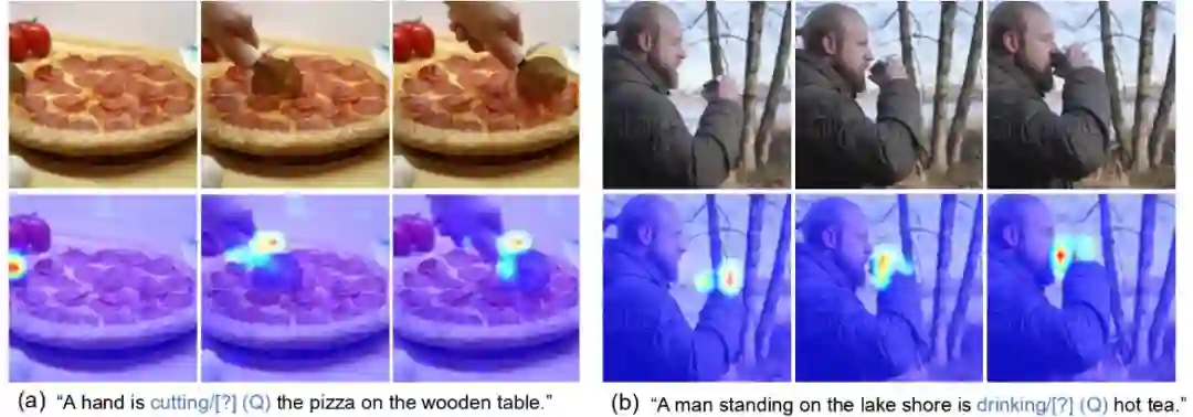 下图为可视化动词问题特征和视频特征之间的注意力。下图依次展示了一个视频里采样得到的三帧。文本里蓝色的动词短语被抹除,构成了动词问题。在左边的例子里,当 “切” 这个动词被抹去,构成问题 “一双手正在如何操作比萨饼”,BridgeFormer 关注比萨饼上餐具的移动。在右边的例子里,当“喝” 这个动词被抹去,构成问题“站在河边的男人正在怎么操作热茶”,BridgeFormer 关注握着杯子的手的移动。我们可以观察到,BridgeFormer 集中注意力在物体的移动上来回答动词问题,这表明 VideoFormer 捕获到了视频的时序动态。