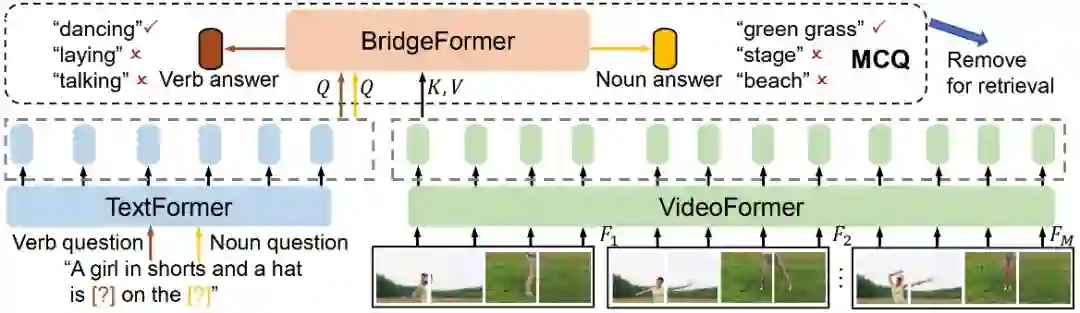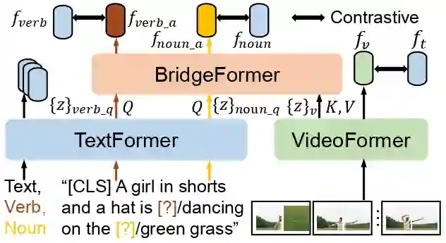 如下图所示,该研究的方法包含一个视频编码器 VideoFormer,用来从原始的视频帧提取视频特征;一个文本编码器 TextFormer,用来从自然语言提取文本特征。该研究通过抹去文本描述里的名词短语或动词短语,来分别构造名词问题和动词问题。以对比学习的形式,训练 BridgeFormer 通过求助 VideoFormer 提取到的局部视频特征,从多个选项里挑选出正确的答案。这里,多个选项由一个训练批次里所有被抹去的短语构成。