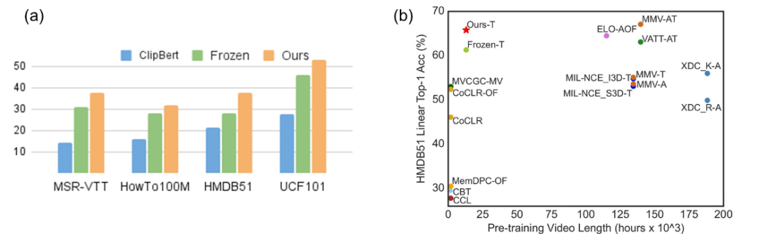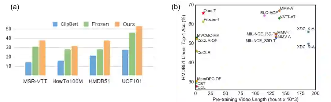 在 HMDB51 和 UCF101 上测评 zero-shot 动作识别结果如下图(a)所示,本文方法明显超出了 baseline。该研究进一步通过测评 linear 动作识别来衡量模型的单模态视频表征能力。如下图(b)所示,本文方法在时长相对较短的视频数据上进行预训练,取得了理想的结果。这显示了该研究的借口任务 MCQ 可以通过对文本语义的有效利用,增强视频的表征学习。