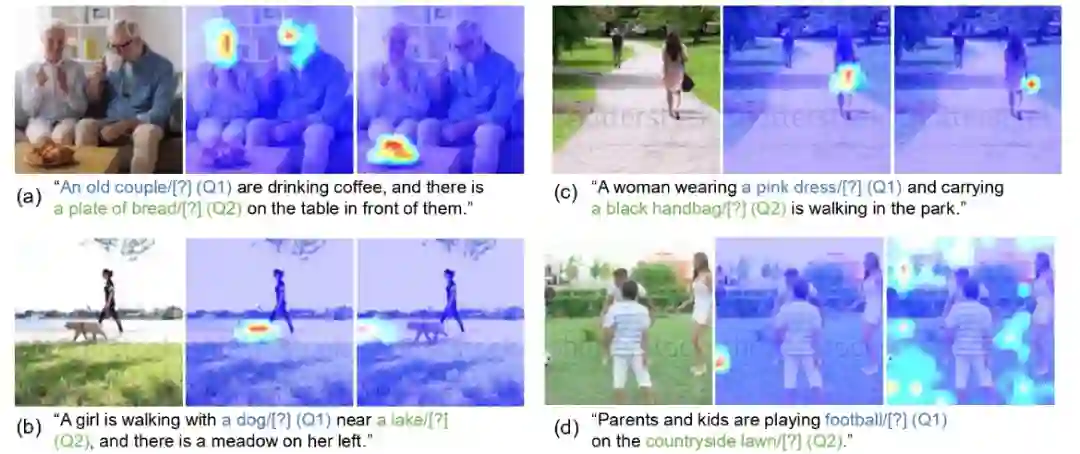 下图为可视化名词问题特征和视频特征之间的注意力。在第二列和第五列,文本里蓝色的名词短语被抹除,构成了名词问题 Q1。在第三列和第六列,文本里绿色的名词短语被抹除,构成了名词问题 Q2。在第一个例子里,当 “一对老年夫妻” 被抹去,构成问题 “谁在喝咖啡”,BridgeFormer 专注于描绘人物面貌的视频特征上。而当“一盘面包” 被抹去,构成问题 “在他们面前的桌子上有什么”,BridgeFormer 把注意力集中在桌子上的物体区域。在第四个例子里,当“足球” 被抹去,构成问题 “家长和小孩在玩什么”,BridgeFormer 专注于可以和动词“玩” 构成关联的物体特征上。而当 “乡间草地” 被抹去,构成问题“家长和小孩在哪里踢足球”,BridgeFormer 把注意力放在了视频背景特征上。我们可以观察到,BridgeFormer 关注具有特定物体信息的视频区域来回答名词问题,这表明了 VideoFormer 可以从视频中提取准确的空间内容,并且 TextFormer 可以理解问题的文本语义。