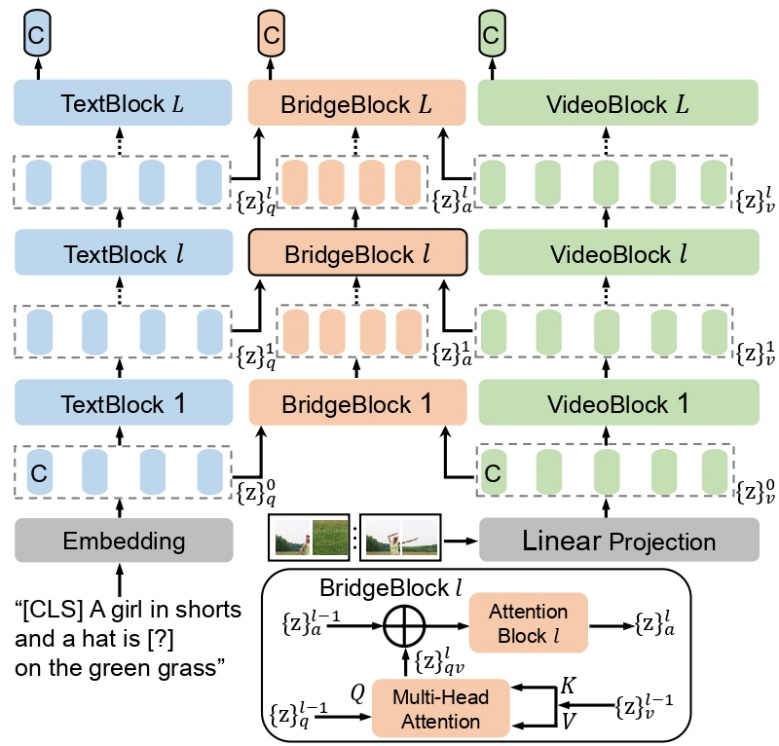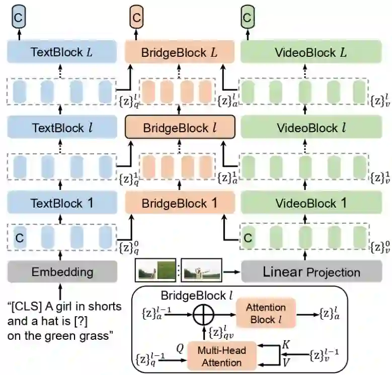 如下图所示,该研究的模型包含一个视频编码器 VideoFormer,一个文本编码器 TextFormer,和一个辅助的编码器 BridgeFormer。每一个编码器由一系列 transformer 模块构成。TextFormer 输出的每一层问题文本特征被视为 query,VideoFormer 输出的每一层视频特征被视为 key 和 value,被送入 BridgeFormer 相应层来执行跨模态的注意力机制,以获得回答特征。