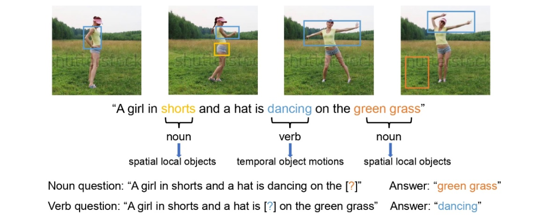 如下图所示,该视频的文本描述为:“一个穿着短裤,戴着帽子的女孩正在绿草地上跳舞”。这其中,名词短语 “短裤” 和“绿草地”对应着视频里的空间局部物体,动词短语 “跳舞” 则可以反映视频里女孩的时序移动。因此,该研究通过抹去文本里的名词和动词短语,来分别构造名词问题和动词问题,那么正确的答案自然是被抹去的短语自身。比如当抹去名词短语“绿草地”,就构成了名词问题“一个穿着短裤,戴着帽子的女孩正在哪里跳舞”,答案就是“绿草地”。同理当抹去动词短语“跳舞”,就构成了动词问题“一个穿着短裤,戴着帽子的女孩正在绿草地上做什么”,答案就是“跳舞”。