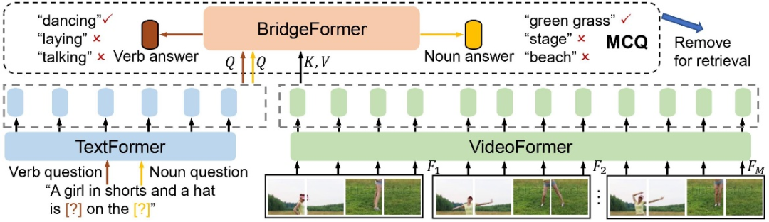 该研究提出一个带有参数化模块 BridgeFormer 的借口任务叫做多项选择题(MCQ),训练 BridgeFormer 通过求助视频特征,回答由文本特征构成的选择题,从而实现细粒度的视频和文本交互。在下游检索时移除 BridgeFormer,来保证高效的检索效率。