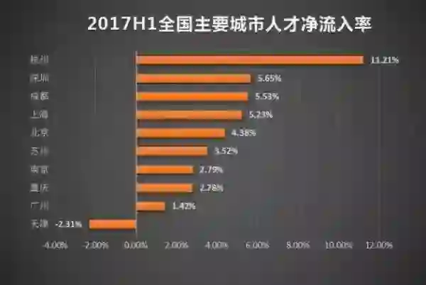 另据猎聘网的大数据报告统计,在2017年上半年全国主要城市人才净流入率排名中,杭州以11.21%的人才净流入率位居榜首。