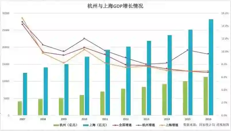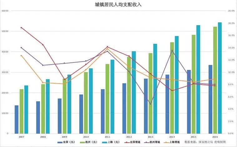 2016年,杭州与上海的城镇居民人均可支配收入分别为52185元、57692元,相差约5000元的水平,而二者均明显高于全国城镇居民人均可支配收入33616元。