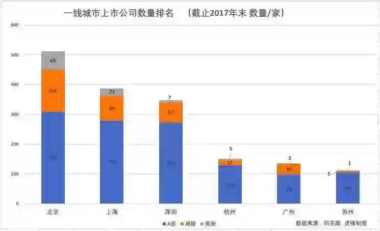 上市公司数量上,杭州以151家名列第四,排在广州、苏州之前。值得注意的是,截止2017年末,浙江省的境内外上市公司数量达到507家,排名全国第二,在去年A股新上市的438家公司中,有87家是浙江企业,占比超20%;证监会半个月前公布的439家公司IPO在审名单中,浙江就有51家,仅次于江苏的70家。