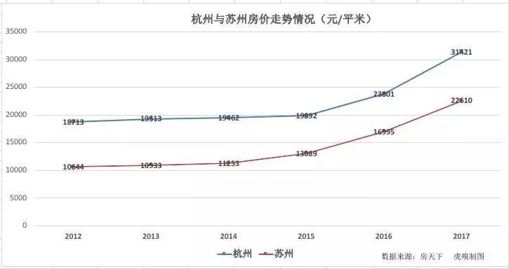 杭州常驻人口少于苏州(2017年杭州比苏州少122万人),杭州距离上海远,其宅地供给量大于苏州,而镇居民人均可支配收入低于苏州,但平均房价却高出1万,目前仍在攀升,显然杭州房价是偏高的,即便“认房又认贷”限购,但对于绝大多数杭漂的年轻人而言,还是有一定距离。