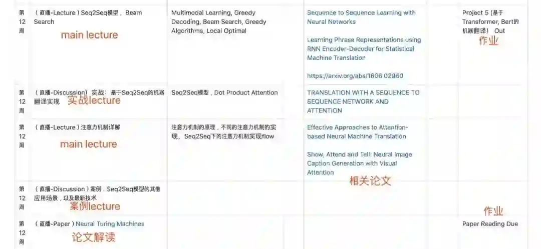 我们主要采用直播的方式,一周4-5次的直播教学, 包括2次的main lectures, 1-2次的discussion session (讲解某一个实战、必备基础、案例或者技术上的延伸), 1次的paper reading session (每周会assign一篇必备论文,并且直播解读)。教学模式上也参考了美国顶级院校的教学体系。 以下为其中一周的课程安排,供参考。