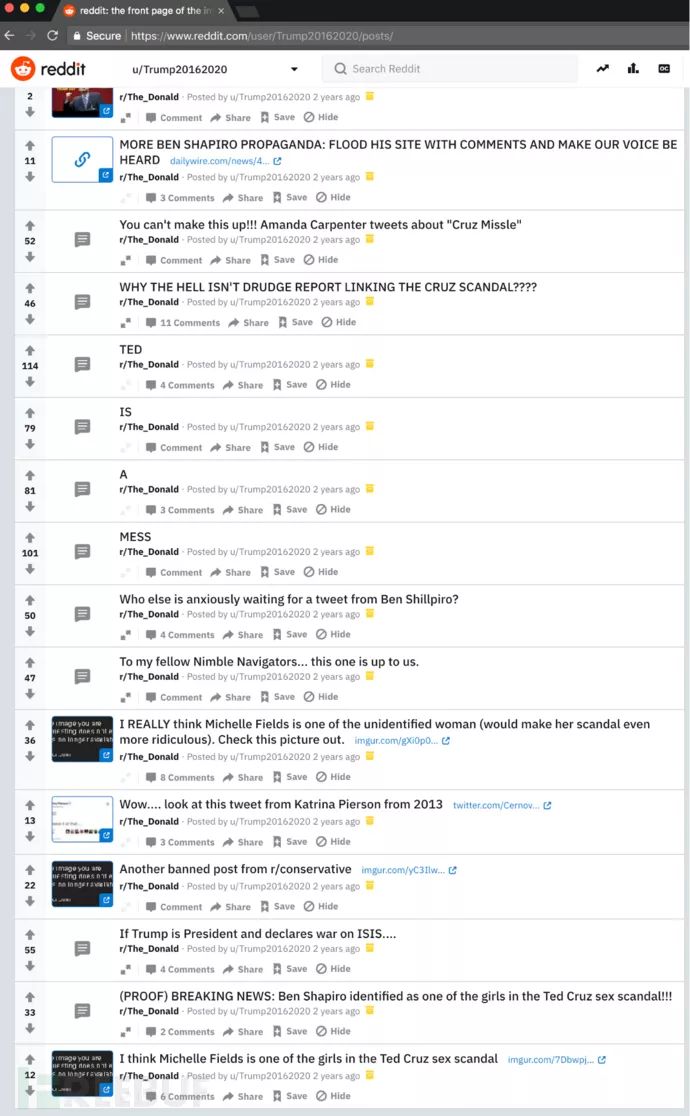 深入分析后,我们还在Reddit论坛中找到了americafirstpolitics.com网站的文章转发缓存,其中一个名为 Trump20162020 的账号引起了我们的注意,该账号创建于2016年3月25日。根据特别检察官 Robert Mueller 2月16日针对俄罗斯IRA机构的起诉书中可看出,俄罗斯特工还活跃于社交媒体中,这个Trump20162020账号会在同一天转发几篇文章,且一直活跃到了2016年7月4日,共101天,而且该账号的大部份发文都转发到了Reddit子论坛 “TheDonald”(特朗普吧)中,该论坛帖子大部分都是表达对特朗普的支持,Trump20162020在账号创建的当天就在 “TheDonald”论坛中发文17次,内容大多是共和党参议员总统候选人特德·克鲁兹(Ted Cruz)毫无根据的性丑闻。