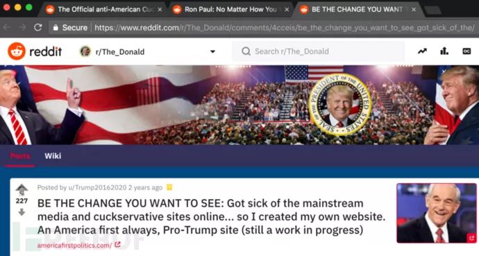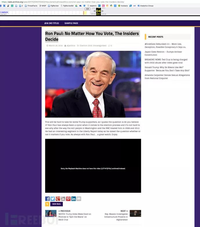 在 Wayback Machine 的网络存档中,我们检索到了americafirstpolitics[.]com 域名架设网站的快照,网站文章的标题就是 - 罗恩·保罗:不管你如何投票,反正已经内定了(Ron Paul: No Matter How You Vote, The Insiders Decide),罗恩·保罗为前美国众议院议员,其中还有一段文字表达了对美国选举程序的不信任,下面还附带了罗恩·保罗与此意思表述的一个采访视频。在最新的发文中,我们看到了以下内容: