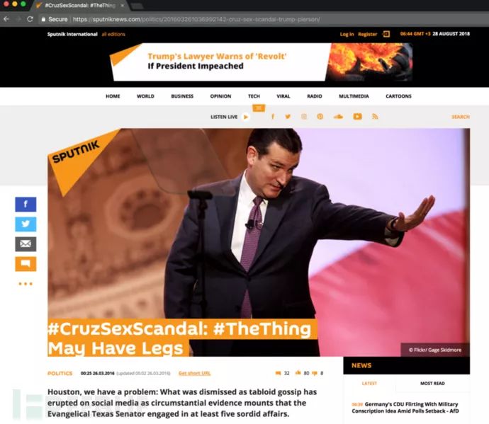 这些性丑闻帖子都是基于美国八卦杂志National Enquirer的报道,而该杂志有特朗普私人关系背景,此前对特朗普竞争对手有过攻击立场。而此时,共和党参议员特德·克鲁兹(Ted Cruz)可以算是唯一一个能与特朗普抗衡的竞争对手。且恰巧,俄罗斯卫星通讯社(Sputnik)也曾对特德·克鲁兹(Ted Cruz)丑闻有过大篇幅报道。