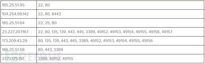 IP地址 23.227.207.167 和 173.209.43.29 有一些几乎相同的开放端口,有意思的是,它们开放的端口通常用于NetBIOS和DCOM服务,由于这些服务可以识别主机服务器可被漏洞利用的服务,因此这些端口不应曝露在互联网上。IP地址 185.25.51.64开放了SMTP的25端口,这可能是攻击者用于发送网络钓鱼相关的电子邮件。