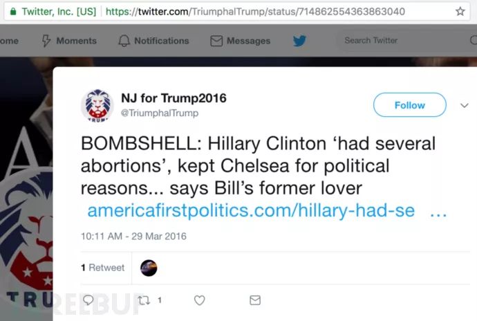 americafirstpolitics[.]com网站还报道过一篇希拉里·克林顿有“几次堕胎”的虚假新闻,另外,还从National Enquirer转载过反对特德·克鲁兹(Ted Cruz)的报道,其中声称特德·克鲁兹父亲刺杀肯尼迪的计划,等等....。在Twitter上有大量传播americafirstpolitics[.]com网站报道的账户,其中的每一条推文都是在americafirstpolitics[.]com网站发文后两天发出的。