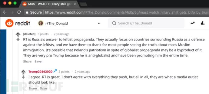 在另一篇与今日俄罗斯(RT)视频相关的帖子中,有一个被删除用户表达了对今日俄罗斯(RT)的赞赏,Trump20162020 也发表了支持看法:“今日俄罗斯很厉害,我虽不赞成他们所有的报道,但总之,这才是一个新闻媒体该有的样子”。在2017年美国国家情报总监的报告中,今日俄罗斯(RT)俨然成为了具备俄罗斯国家背景的宣传机器。
