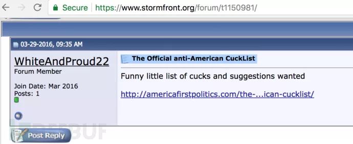 同时,我们的搜索查找还在白人民族主义者网站stormfront[.]org论坛中发现了一个americafirstpolitics[.]com的内容链接,链接标题为“The Official anti-American CuckList”。根据特别检察官 Robert Mueller 2月16日针对俄罗斯特工和俄罗斯互联网研究机构(Internet Research Agency,IRA)提交的调查起诉文件反映,俄罗斯情报机构被指示通过支持激进团体,利用社会矛盾、经济形势和反社会活动来制造网络热点,进行扩大炒作宣扬。