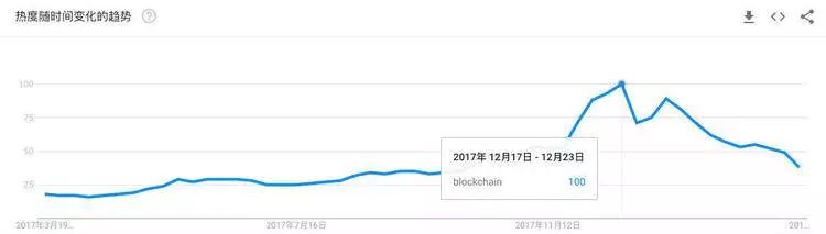 在 2017 年圣诞节前后,欧美的区块链热潮达到顶峰,一同达到顶峰的还有比特币的价格:在 12 月中旬首次突破 2 万美元。据说很多美国人是拿着年终奖来不及圣诞节扫货,直接去买比特币。不过,有高潮就有低谷,随着比特币价格从 2 万美元高点跌落,人们在 Google 上搜索区块链的热度也不断降低,截至目前 Google Trends 上区块链关键字的热度已经和去年 11 月份持平。
