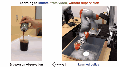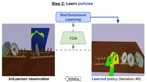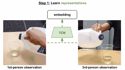 通过强化学习来学习规则。基于TCN嵌入,根据第三方的真人示范来构造奖励函数。机械臂起初尝试一些随机动作,然后学会反复进行这些动作,就可以产生最高奖励的控制步骤,最后达成重现视频任务的效果。