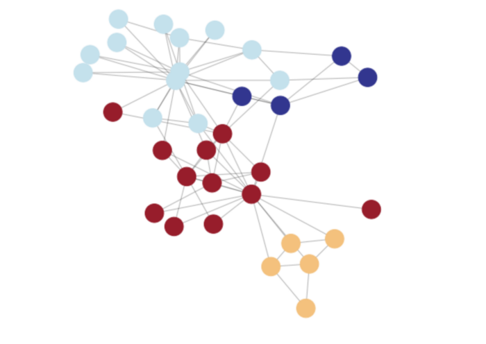 comp = community.girvan_newman(G_karate)for communities in itertools.islice(comp, k):