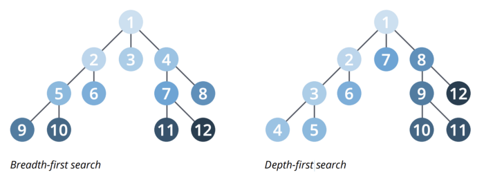 宽度优先搜索(BFS):首先探索每个节点的相邻节点,然后探索相邻节点的相邻节点……