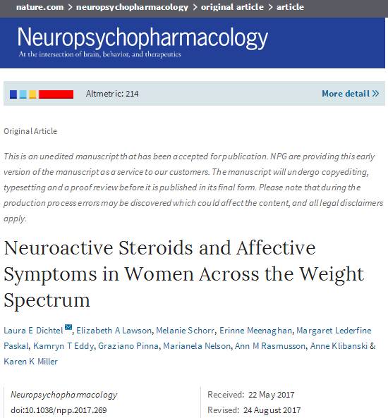 参考资料:Laura E Dichtel et al, Neuroactive Steroids and Affective Symptoms in Women Across the Weight Spectrum, Neuropsychopharmacology (2017). DOI: 10.1038/npp.2017.269