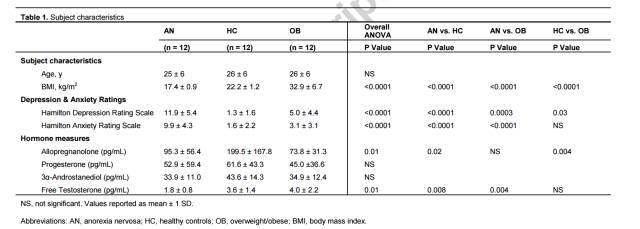 在本次研究中,研究人员一共选取了36名参与研究的女性,包括12名厌食症女性患者,她们都存在闭经的情况且她们的身体质量指数(BMI)低于18.5;12名正常体重患者,她们的BMI介于19和24之间; 12名肥胖妇女,BMI≥ 25。