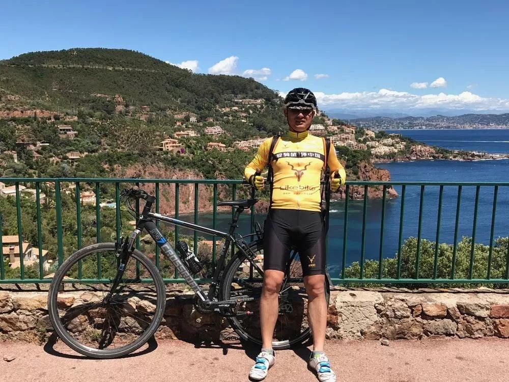 ◆ 刘刚剑在法国尼斯骑行,他穿得是“爱骑旅”的定制服装。