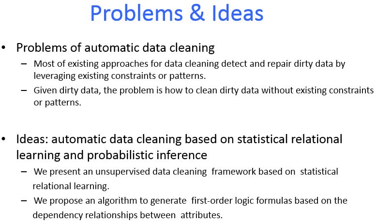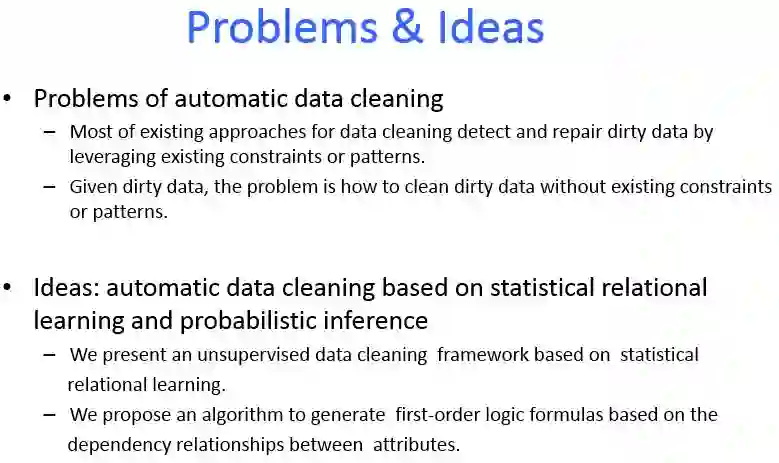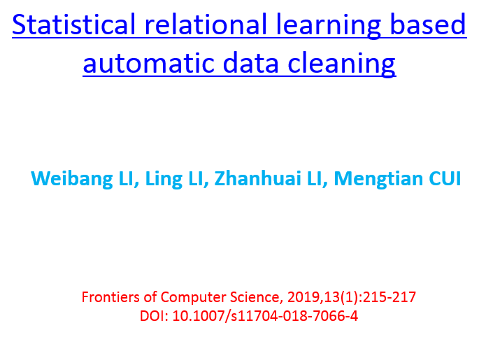现实世界中脏数据十分普遍,从脏数据中检测和修复错误是数据分析领域的主要挑战之一,数据错误和缺失等数据质量问题直接影响到数据分析结果的准确性。过去几十年中,脏数据清洗是数据管理领域的研究热点之一。现有的数据清洗方法通常需要使用现成的约束/规则,或者需要人工介入。在现成的约束/规则缺失的情况下进行数据清洗是一个挑战性问题。本文提出一个基于统计关系学习的脏数据自动清洗方法,从脏数据中学习得到数据表属性之间的贝叶斯网络,进而转换成一阶谓词逻辑,基于互信息计算一阶谓词逻辑权重,得到对应的马尔科夫逻辑网络,将马尔科夫逻辑网络转换成DeepDive规则,进而基于DeepDive进行概率推理,推理结果用于错误数据修复和缺失数据填充。基于真实数据集的实验结果表明本文提出的方法能够有效进行脏数据的自动清洗。