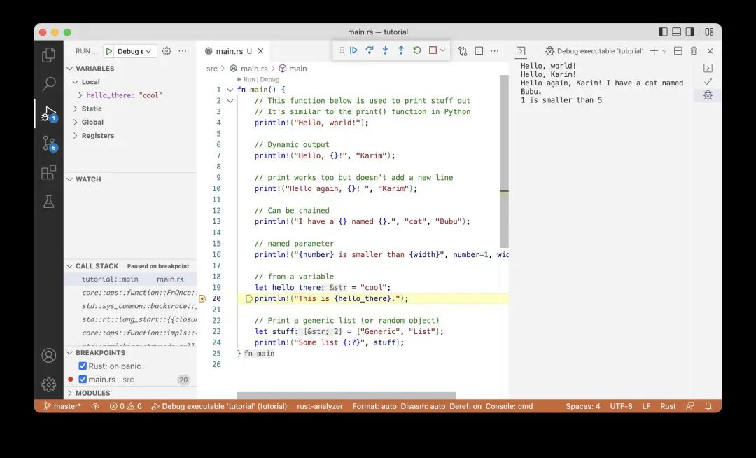 此外,你还可以使用常规调试器。在 M1 上,我推荐在 Visual Studio Code 中使用 LLDB,它不仅工作良好,通常还要比在输出结果中打印日志更为方便。