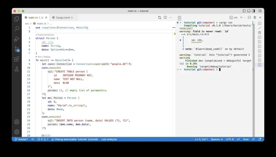 另外,你也可以先运行 cargo build,然后运行 target/debug/tutorial 中的文件,得到的结果是相同的。接下来,如果将生成的文件复制到另一个位置或另一台类似的机器上,也可以正常工作,且无需安装任何与 Rust 相关的东西。