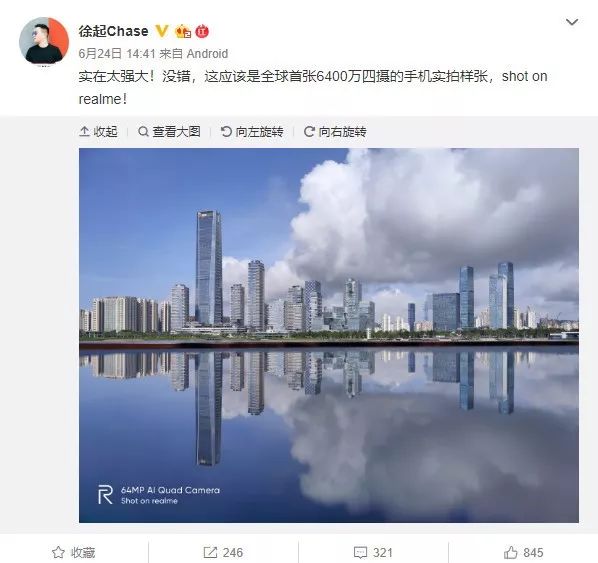 今年 6 月 24 日,realme CMO 徐起发布了一张 6400 万像素手机实拍的样张,样张放大后确实可以展示出更多细节。