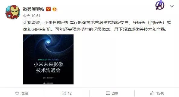 除了极有可能登场的 6400 万像素技术之外,据数码闲聊站爆料,小米还有可能带来潜望式超级变焦,以及预热明年的亿级像素、屏下超清成像等技术和产品。