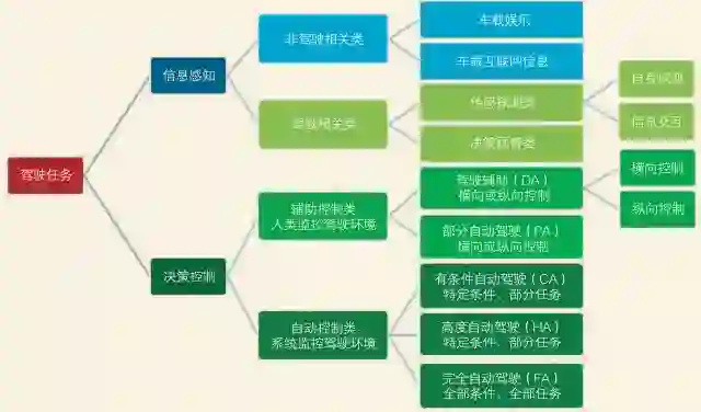 在决策控制方面,根据车辆和驾驶员在车辆控制方面的作用和职责,区分为「辅助控制类」和「自动控制类」,分别对应不同等级的决策控制。其中,辅助控制类主要指车辆利用各类电子技术辅助驾驶员进行车辆控制,如横向控制和纵向控制及其组合,可分为驾驶辅助(DA)和部分自动驾驶(PA);自动控制类则根据车辆自主控制以及替代人进行驾驶的场景和条件进一步细分为有条件自动驾驶(CA)、高度自动驾驶(HA)和完全自动驾驶(FA)。