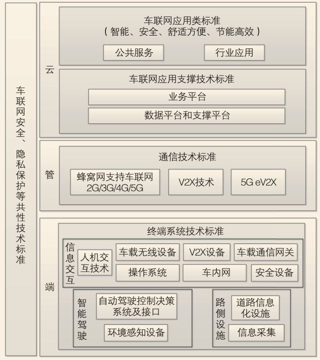 车联网作为物联网的典型应用,车(智能汽车)、网(通信)、路(智能交通)、牌(车辆智能管理)和电子产品 5 大重点领域的标准都应当分为感知层(端)、网络层(管)和应用层(云)三个层次,如图 2 所示。