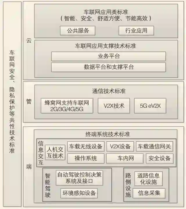 相关标准主要包括车辆信息通信的基础——通信协议,主要涵盖实现车与 X(人、车、路、云端等)智能信息交互的中短程通信、广域通信等方面的协议规范;在各种物理层和不同的应用层之间,还包含软硬件界面接口的标准规范。