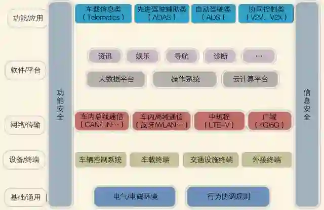 基础和通用层涵盖电气/电子环境以及行为协调规则。安装在智能网联汽车上的设备、终端或系统需要利用汽车电源,在满足汽车特有的电气、电磁环境要求下实现其功能;设备、终端或系统间的信息交互和行为协调也应在统一的规则下进行。