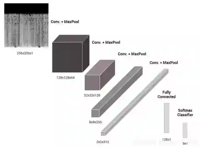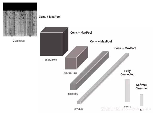 上图是本文搭建的卷积神经网络模型,可以看到,左上边的光谱图像将图像转换成一个表示每个像素的颜色的数字矩阵;之后数据经过卷积层、池化层以及全连接层等处理后送入到右下角的softmax分类器,分类器给出一个9位数的矢量,其中每位分别对应着9种音乐流派的概率,最后选择其中最大概率位置的流派为最终识别流派。